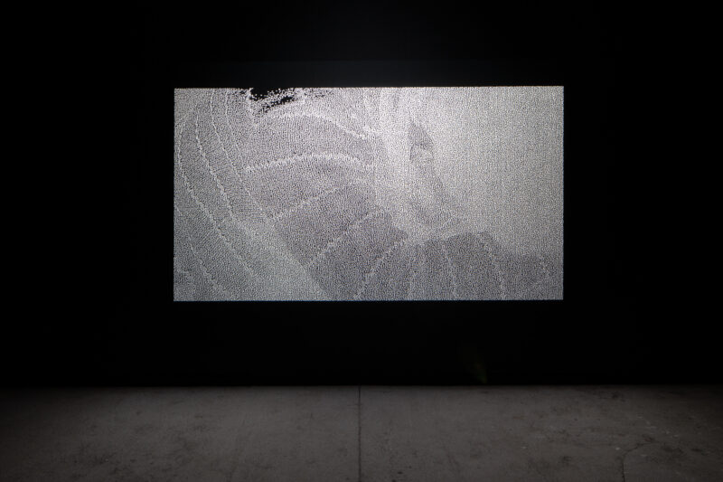 Arrival (2024) is an animation created from a black-and-white press photograph, depicting a group of Iranian men who have arrived at Stockholm Arlanda Airport as political refugees. The men have settled on a sofa. One of them seems to cover his face while the man in the middle leans forward, resting his head in his lap. The original image has been reversed from a positive to a negative and run through a copying machine towards a vanishing point, through the disintegrated pattern of the copying process. These manoeuvres in various ways allude to searching, layers of time, and the nature of memory, like copies of copies. The work has no beginning and no end. With a slow and barely visible movement, the animation zooms in and out of the image in a seamless infinite loop.